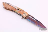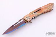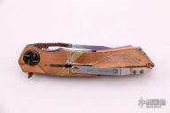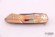 This Mini Mina by Dew Hara features a 15 layered VG-10 Core San Mai Damascus blade with Aurora finish, notched thumbrest and flipper. The handle has a satin finished and engraved copper frame and liners with a titanium tip up clip. #018. Comes with original box, pouch and papers. Excellent condition.