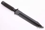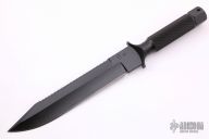 This Jereboam MK II from Chris Reeve is similar to the Shadow series and was made for special forces use. The entire knife was made from a single solid billet of steel. Black coated blade with false top edge. .256" Blade Stock 1.413" Blade Depth. Hardness at between 55 and 57 Rockwell C is not brittle but gives good edge retention along with ease of sharpening. Removable butt cap with storage area in handle. A very nice tactical fixed blade. Has a little wear on the finish, otherwise excellent condition. Made in South Africa and is #530.