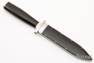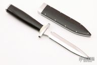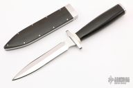 This Dagger by Jim Siska features a mirror finished double edged blade with .127" blade stock and .652" blade depth, hidden tang construction. The handle has a stainless steel guard and butt, black wood grip and a mammoth ivory spacer. Comes with a matching wood and stainless steel scabbard. Has a few light scratches, otherwise excellent condition.