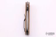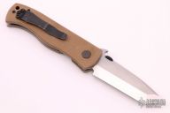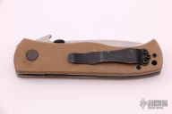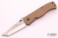 This production CQC-7V-BT by Emerson Knives has a stonewashed v-ground tanto blade with notched thumbrest and thumb disc. The handle has tan G-10 scales, titanium liners, black G-10 backspacer, tip up black stainless clip, lanyard hole. Numbered 331 and dated 2010. Has some light scuffs on the handle, otherwise excellent condition.