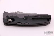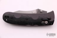 This 420 Resistor is a Mike Snody design executed by Benchmade. The It features a tumble finished clip point blade with dual thumb studs and a notched thumb rest. The handle is comprised of bead blasted and gray anodized aluminum frame with contoured black G10 overlays over a black coated steel subframe and barrel spacers. The black coated, tip up pocket clip is reversible for left or right hand carry. Has some scuffs/scratches, otherwise good condition.