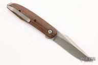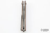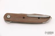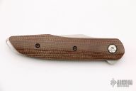 This Cygnet by Nick Swan features a blasted AEB-L blade with elongated swedge and a notched flipper. The handle has a micarta frame with micarta pivot collars and titanium backspacer and a blasted tip up titanium clip with hidden screws. Rides on bearings, nice detent, lockup and blade seating. Comes with COA dated 06/2021. Excellent condition.