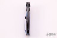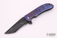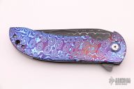 This Framelock Flipper by Melvin Lozada features a Damascus tanto blade with flipper. The handle has a mokuti frame with matching floating backspacer and tip up clip, anodized titanium pivot collars and overtravel stop. Rides on bearings, nice detent, lockup and blade seating. Has a couple light scratches, otherwise excellent condition.