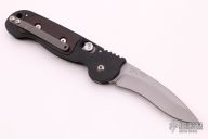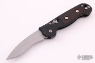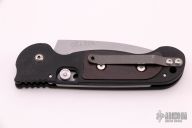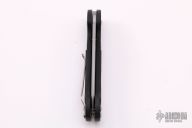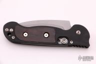 The Drifter by Rob Dalton features a bead blasted recurve blade, textured black G-10 frame with desert ironwood inlays, tip up reversible clip. Fires strong. Perfect function. Notched thumbrest. Excellent condition. Comes with a zippered case.