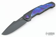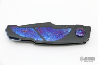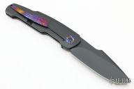 This Boudicca by Anton van der Westhuizen features a black cerakote finished blade with a textured front flipper. The handle has a black cerakote finished titanium frame with timascus twin pockets, pivot, pivot collar, backspacer and tip up clip. Rides on ceramic IKBS, nice detent, lockup and blade seating. Has concealed hardware and overtravel stop. Comes with a zippered case and COA dated 2021. New from maker.