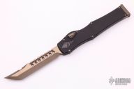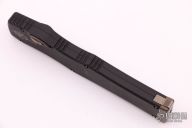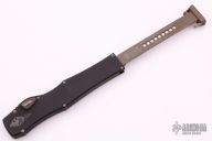 This Halo VI features a bronzed Hellhound tanto blade with satin flats, fullers and notched spine. Its handle is made from black Mil-Spec anodized alloy with bronzed hardware. The charging handle comes marked with the Microtech logo and date of creation along with the serial number. Microtech's Halo VI sets itself apart from previous models with added safety features and an improved charging handle mechanism. The firing button has been upgraded with an integrated safety to prevent accidental deployment. Its upgraded charging handle is built with dual pivoting latches that create a secure seal in the closed position. Comes with original box and papers. Dated 09/2018. Excellent condition. Comes with a custom kydex sheath with TekLok.
