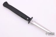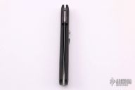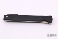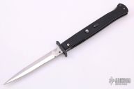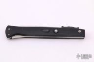 This Phantom Italian swing guard automatic by Dynamic Knife Designs has a satin finish blade and black aluminum handle. Features a ramped side positioned stainless steel safety just below the firing button. False top edge. Button release/single action with closure via the rear positioned lockbar release. Dual leaf and coil spring action providing an extremely fast opening. When closed, the dual guard rests on the frame, encompassing the blade tang. Upon opening, the guard swings into a locked position. Has some light scuffs, the blade has been polished and resharpened, otherwise good condition.