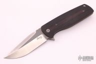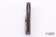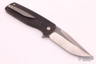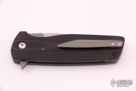 This Myrmidon XL flipper from Mr. Tim Curry features a satin finished blade with false top edge, notched thumbrest and flipper. The handle is comprised of bead blasted titanium liners, red/black G-10 scales, bead blasted titanium pocket clip that is positioned for tip up carry. Blade is centered when closed, nice detent and locks up with no play. This piece is in excellent condition. It comes with a leather zippered case.