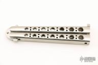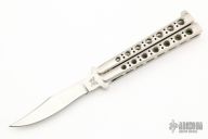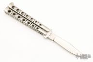 This early balisong from Pacific Cutlery features a Jody Samson ground satin finished blade with long clip point. The handles are stainless steel with hole pattern, has t-latch. Has a few light scratches, otherwise excellent condition. Includes original nylon sheath.