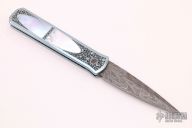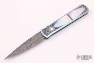 This one of a kind knife features a Robert Eggerling Damascus blade with a false top edge. The titanium handle has  been engraved and signed by Bruce Shaw,  mirror polished with mother-of-pearl inlays, and jeweled interior. This is a beautiful knife a work of art and an excellent addition to any collection.  Comes with original collector case and papers. Excellent Condition.