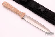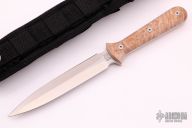This Dagger from Pro-Tech Knives is a Walter Brend design, it features a satin finished double-edged blade and a full tang construction.  .191" blade stock and .987" blade depth. The handle has curly maple scales. Includes kydex lined nylon sheath with belt loop and the original box. Excellent condition.