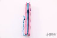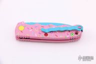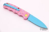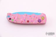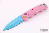 Have you ever been unfortunate enough to have to share a donut? Your plight only gets worse when you find you have to cover your high-speed, low-drag, modified, custom, mirror-edged piece of pocket jewelry in sticky sweetness. What you need is a knife designed from the ground up to go to war with a donut. And although its path to existence was unorthodox, the Dessert Warrior is here! This automatic will snap open before anyone can take more than their half of the donut. The handle is bright pink with sprinkles, and the blade has a candy blue finish, making the knife blend in with the pretty pastries of the shop. Gone are the days of not having the right tool for the job!