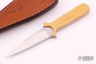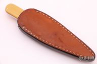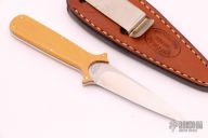 This Boot Knife by Tim Britton has a satin finished blade with full tang, .129" blade stock and .799" depth. Handle has vintage Westinghouse paper micarta scales. Comes with brown leather sheath with stainless steel clip. New from maker.