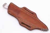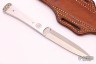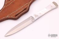 This Dagger by Tim Britton has a hand rub satin finished double edged blade with full tang, .124" blade stock and .803" depth. Handle has engraved nickel silver rear bolsters, mother of pearl scales with nickel silver pins and inlays. Comes with brown leather sheath. New from maker.