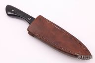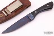 This Boot Knife by Tim Britton has a blued Damascus blade with full tang, .155" blade stock and 1.151" depth. Handle has blued mosaic Damascus bolsters, black paper micarta scales. Comes with brown leather sheath with stainless steel clip. New from maker. Has some oxidation on the Damascus, otherwise good condition.