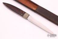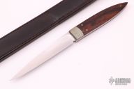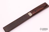 This Desk Knife by Howard Viele features a hand rub satin finished blade with .145" blade stock and .759" blade depth, full tapered tang construction. The handle has a textured nickel silver bolsters and pins with wood (cocobolo?) scales. Comes with a brown leather desk sheath. Excellent condition.