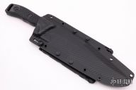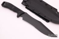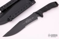 This Arbiter by Microtech features a black recurve full serrated blade with a notched thumbrest and sharpened top edge. The handle has black G-10 scales with black hardware. .209" blade thickness and 1.876" blade depth, full tang construction. Butt has a lanyard hole. Comes with kydex sheath with molle locks. Comes with original box. Serial number 2633 and dated 05/2021. Excellent condition.