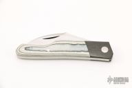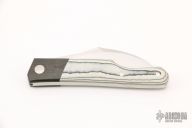This Todd Cuso Tribute Knife by David Taber is a Long Nquyen Design. It features a hand rub satin finished wharncliffe blade with nail nick. the handle has black carbon quartz bolsters, black/white carbon quartz covers, stainless steel liners and spring. Has half-stop, flush in all positions. Comes with padded case, and COA dated May 2018. Excellent condition.