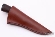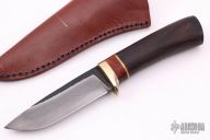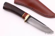 This Utility Bushcraft Hunter by Last Knives features a drop point blade with nice hamon, .213" blade stock and 1.129" blade depth, hidden tang construction. The handle has a brass guard with a Japanese rosewood grip, red amboyna and brass spacers, buffalo horn butt with natural blue topaz inlay. Comes with a brown leather sheath and COA. New from maker.