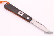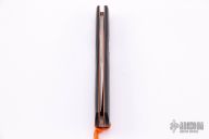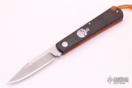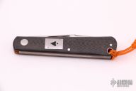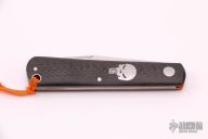 This Single Bevel slipjoint by Dewayne Chancellor features a two-tone chisel ground blade with swedge and nail nick. The handle is comprised of carbon fiber covers with white and orange G-10 liners, stonewashed 1095 spring, stainless steel escutcheons that have been hand carved, lanyard hole. Comes with a leather pouch. This knife features a half stop. Has some light scratches, otherwise excellent condition.