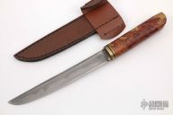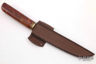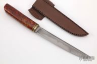 This Kwaiken by Murad Custom Knives features a nice hamon, .222" blade stock and 1.019" blade depth, hidden tang construction. The handle has a brass guard and an amboyna burl wood scales. Comes with a brown leather sheath and COA. New from maker.