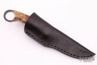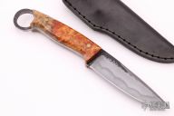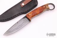 This Spinsharp by Murad Custom Knives features a nice hamon, .184" blade stock and 1.111" blade depth, full tang construction. The handle has two-tone amboyna burl wood scales with brass pins and liners. Comes with a black leather sheath and COA. New from maker.