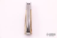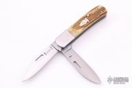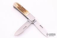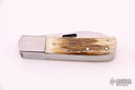 This Scagel Series #3 by Northwoods Knives is 1 of 200. It features a clip and drop point blade. The handle has stainless steel bolsters, stainless steel spring and liners. Stag covers, and nickel silver escutcheon. Comes with original box and soft pouch. Has some light scuffs and scratches, otherwise excellent condition.