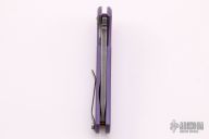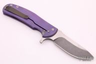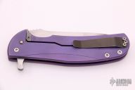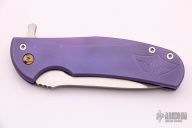 This Ferox by Ferrum Forge features a two-tone blade with satin finished flats and tumbled grinds, notched thumbrest and flipper. The handle is bead blasted and Custom Anodized titanium with anodized pivot, tip up clip and barrel spacers. Features internal over travel arrestor in the stainless steel lockbar insert. Nice detent, lockup and blade seating. Included with the knife is a zippered case with original dogtag. Excellent condition.