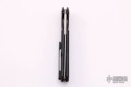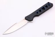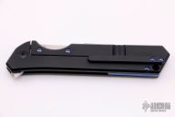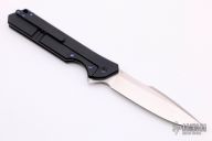 This Rainmaker by Olamic Cutlery features a satin finished harpoon blade with a notched flipper. The handle has a black Gunkote titanium frame with matching titanium tip up pocket clip and anodized titanium floating backspacer. Nice detent, blade seating and lock up. Includes original zippered case and COA dated 6-16-19. Excellent condition.