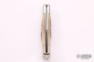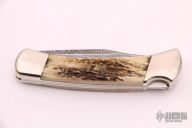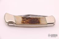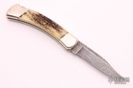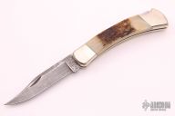 This lock back folder by Buck features a Damascus clip point blade with nail nick. The handle has nickel silver frame and stag inlays. Comes with brown leather sheath. Has some light scratches, otherwise excellent condition.