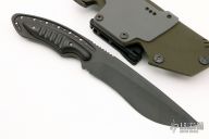 This Anago Fixed Blade from Todd Begg features a drop point recurve DLC coated blade with swedge, .197" blade stock and 1.395" blade depth. The handle has carbon fiber scales over full tang construction with notched thumb rest. Includes Kydex sheath. Has some sheath marks otherwise excellent condition.