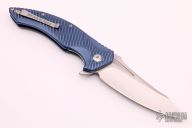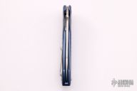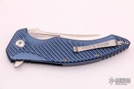 This T-4 by Brous Blades features a satin finished clip point blade with swedge, notched thumb rest and flipper. The handle is comprised of milled and anodized aluminum over a steel liner. The steel tip up clip is positioned for tip up, left or right reversible. Nice blade seating, detent and lock up. Excellent condition. Includes original box and maker's card dated 12/1/16 and s/n 399/500