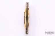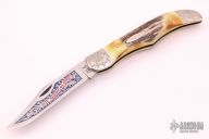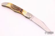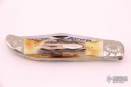 This knife by Case Knives features a clip point blade with a single nail nick. The handle has front and rear engraved nickel silver bolster, stag covers all over brass liners. Excellent Condition.