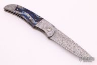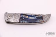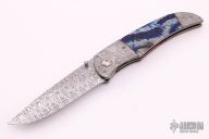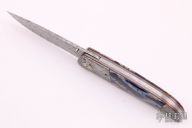 This LL-B Folder by George Muller features a Ladder Pattern Damasteel blade with a single thumbstud. The handle has Gibeon Meteorite dovetailed bolsters, front and rear, titanium pivot collars, mammoth tooth scales with red/black liners, anodized titanium liners, Damasteel backspacer.  Comes with COA, zippered case and wooden box. Features IKBS, nice detent, lockup, action and blade seating. New from maker.