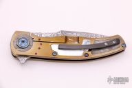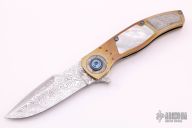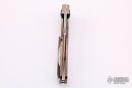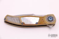 This LL-XX Framelock Flipper by George Muller features a Vinland Pattern Damasteel blade with a flipper. The handle has an anodized titanium frame with mother of pearl and Meteorite inlays, Meteorite pivot collars, zirconium tip up clip, anodized titanium hardware, zirconium pivot collars, has 8 rubies set in the frame.  Comes with COA, zippered case and wooden box. Features IKBS, nice detent, lockup, action and blade seating. New from maker.