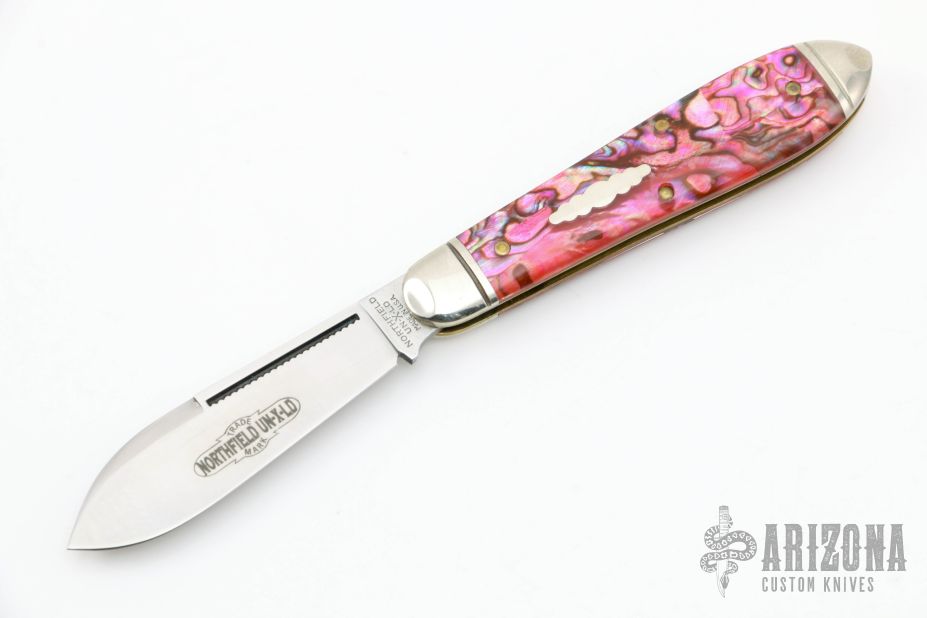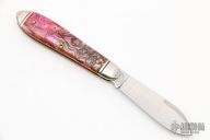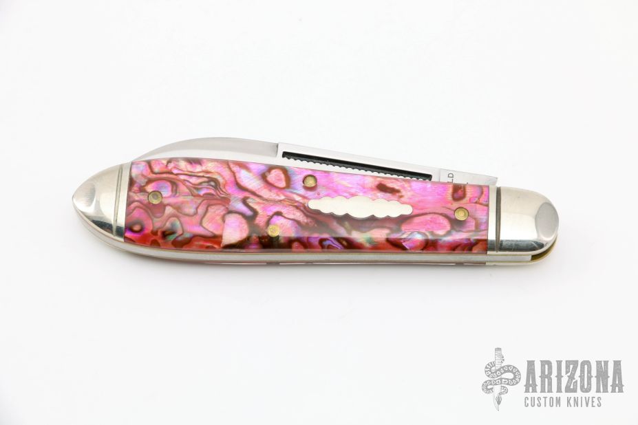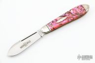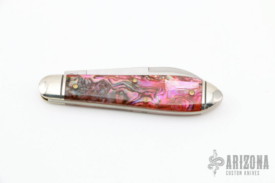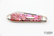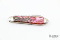 This slipjoint by Great Eastern Cutlery features a satin finished blade with nail nick. The handle has nickel silver bolsters and brass liners, pink synthetic covers. Comes with original packaging. Excellent condition.