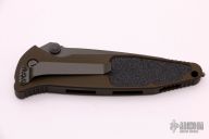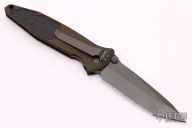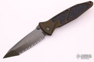This Socom Elite from Microtech has a green fully serrated tanto blade with dual thumbstuds and notched thumbrest. The handle has a green aluminum frame with non-slip inserts and a tip down green stainless steel clip. Dated 10/2012 and S/N 02815. Excellent condition.