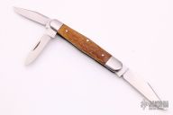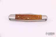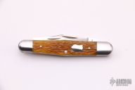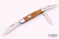 This knife by Ken Erickson features 3 hand rub satin finished blades with nail nicks. The handle has stainless steel bolsters, honey Jigged Bone covers, stainless steel liners and springs. Has half-stops, flush in all positions. Comes with a zippered case. Excellent condition.