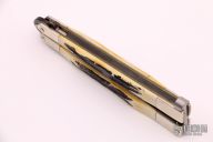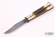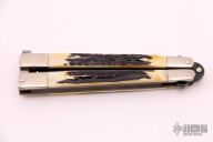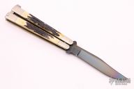 This Balisong by Bear MGC features a black blade. The handles have nickel silver bolsters, stag scales, brass liners and a stainless steel T-latch. Comes with black nylon sheath. Has some scratches, otherwise good condition.