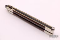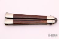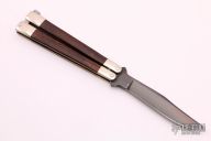 This Balisong by Bear MGC features a black blade. The handles have nickel silver bolsters, cocobolo scales, brass liners and a stainless steel T-latch. Has some scratches, otherwise good condition.