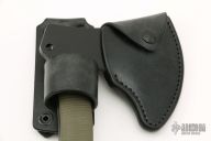 This Cruiser Axe by Defiant7 features a black S7 Blade and 3d machined OD green G-10 scales, .282" blade stock, full tang construction. Comes with a black leather sheath and frog made by Chattanooga Leather Works. Comes with original box. New from maker.