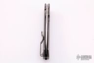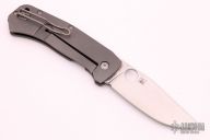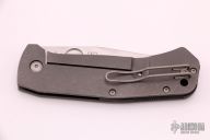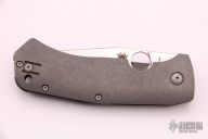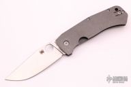 This Slysz Bowie by Spyderco features a tumble finished blade with notched thumbrest and thumbhole. The handle has a tumble finished titanium frame with notched black G-10 backspacer and tip up, left or right reversible clip. Nice detent, lockup and blade seating. Excellent Condition.