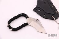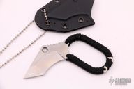 This Polished Hybrid by Hideaway Knives features a satin finished tanto recurve blade with notched thumbrest and cord wrapped grip, .130" blade stock and 1.010" blade depth, full tang construction. Comes with a kydex neck sheath and original packaging. New from maker.