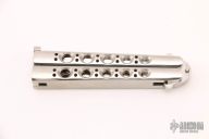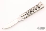 This early balisong from Pacific Cutlery features a Jody Samson ground blade with satin grinds and mirror polished flats. The handles are stainless steel with hole pattern. Has a few very light scratches, otherwise excellent condition. Includes a zippered case.