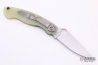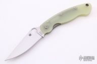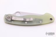 This Military by Spyderco has a satin finished blade with notched thumb rest and thumb hole. Handle is jade G-10, with stainless steel single liner (lock), standoffs, stainless steel tip down clip, and lanyard tube pin. Excellent condition. Comes with original box and papers. This knife was a Blade HQ Exclusive.