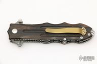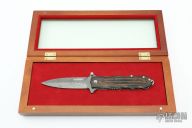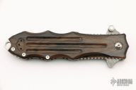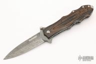 This knife by Blackhawk! Features a Damascus dagger style blade with a notched thumb ramp and flipper. The handle is composed of Ziricote Hardwood Scales over steel liners. The bronzed tip up pocket clip is reversible. Includes original box, display case and knife sleeve. S/N # 130/500. Excellent Condition.