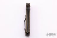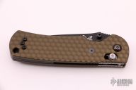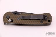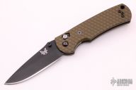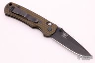 This Griptilian by Benchmade features a black blade with a plain edge. The handle has custom OD Green aluminum scales with inlaid stainless steel liners, brass barrel spacers. The pocket clip can be reversed for right or left tip up carry. The AXIS lock system makes the knife easy to open and easy to close. Comes with original box and papers. Excellent condition.