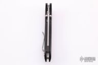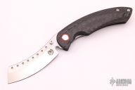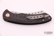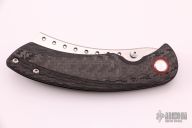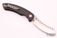 The Red Horse Knife Works Hell Razor P features a stonewash finished blade with dual thumbstuds and a notched thumbrest. The handle has carbon fiber scales with red G-10 pivot collars, inlaid stainless steel liners, tip up bead blasted titanium clip. Comes with original box. Excellent condition.