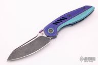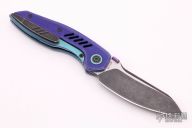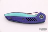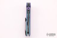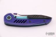 The Ossom from Custom Knife Factory offers a tough titanium build with a stylish gentlemen's carry design. This model is outfitted with a black stonewashed blade and an anodized titanium frame with purple G-10 scales. The curvy profile rests comfortably in the hand while providing a unique look. It has a modified sheepsfoot blade that provides versatile cutting performance. A low-profile titanium pocket clip finishes off this stunning Anton Malyshev design. Bohler M390 blade steel for excellent hardness with corrosion and wear resistance. A steel reinforced frame lock bar with a replaceable steel insert provides secure blade lock up. Ceramic ball bearing system for silky smooth blade deployment. Comes with zippered case, spare parts and COA. This knife has been customized by JD Cutlery. Has a few light marks, otherwise excellent condition.