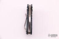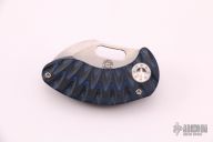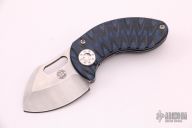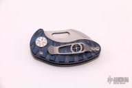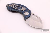 This Nano framelock by Curtiss Knives features a stonewashed sheepsfoot style blade with notched thumbrest and a thumbhole. The handle has black/blue G-10 and tumbled titanium frame with a tip up clip. Has a little vertical blade play, otherwise excellent condition. Comes with a zippered case.